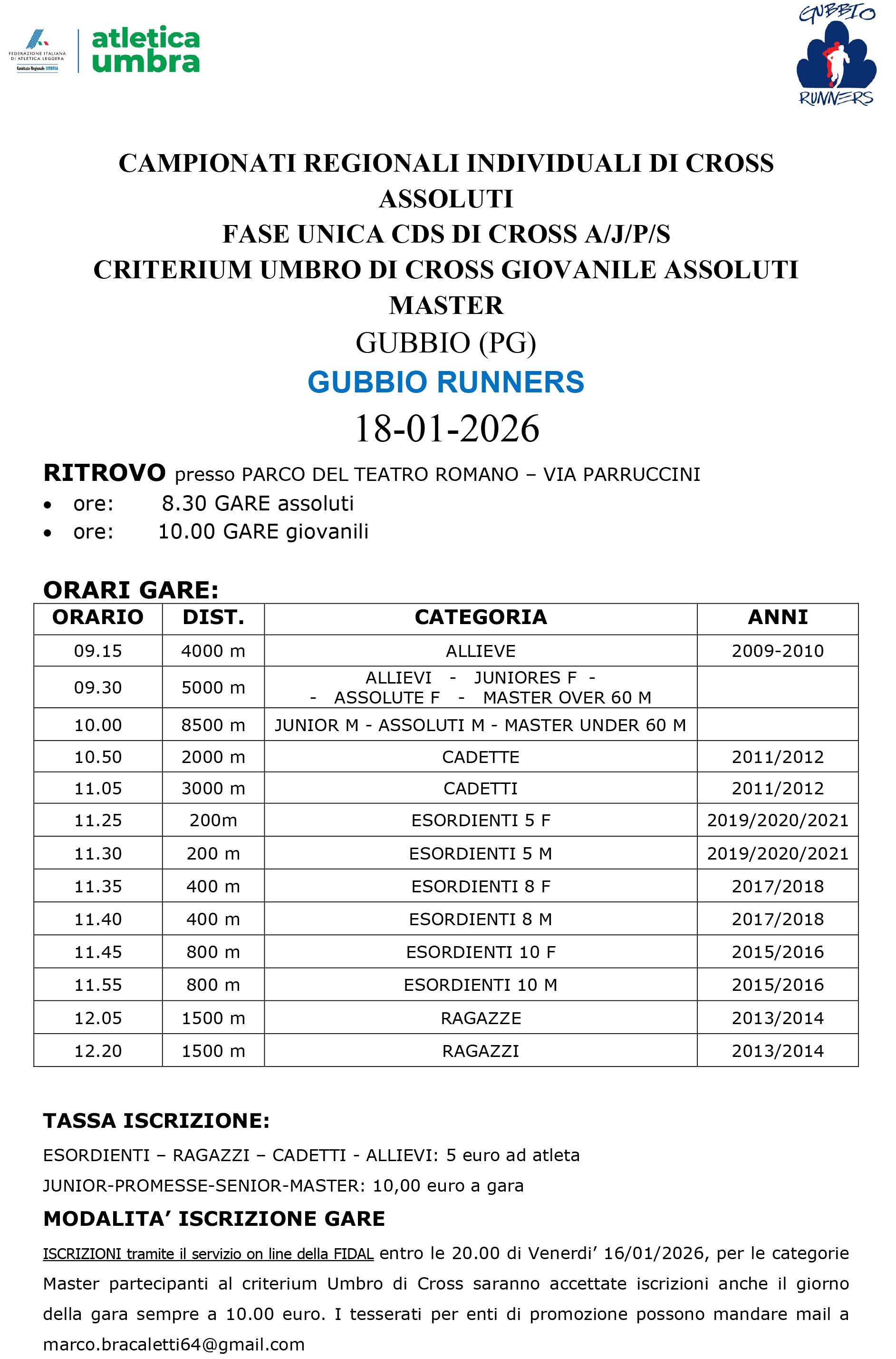 Cross Gubbio 2026, Gubbio (Pg) – Km 5 – Domenica 18 Gennaio 2026